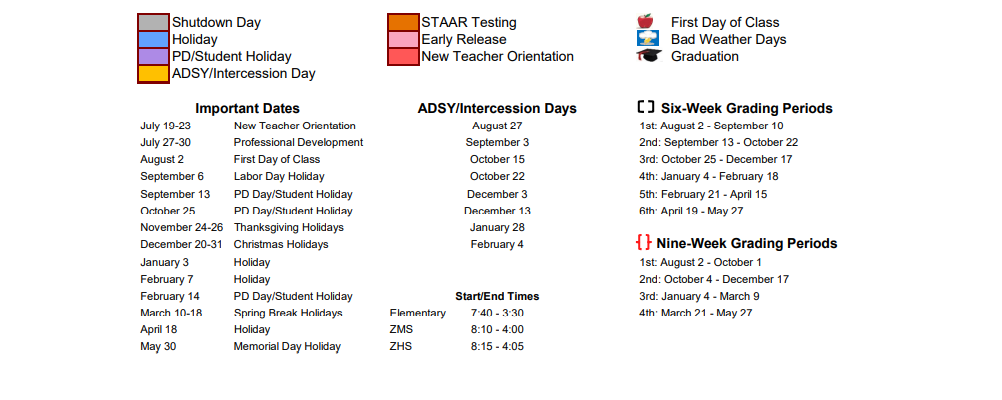 This Zapata County Isd instructional academic school calendar is extremely important as it keeps you informed of Zapata South Elementary School grading periods, early dismissal dates, staff development days and holidays for the Zapata South Elementary School calendar school year 2021-2022. As a parent and or student, you will find yourself needing this information on a regular basis, so please "like" and bookmark this page in a visible location within your favorite browser. The legend for this Zapata County Isd 2021-2022 calendar is at the bottom of the page. If you are browsing on your PC there is another copy of the legend in the right hand column.