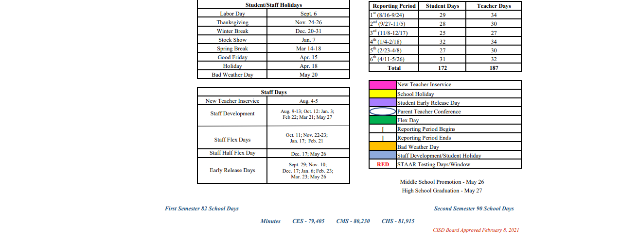 This Comfort Isd instructional academic school calendar is extremely important as it keeps you informed of Comfort Middle grading periods, early dismissal dates, staff development days and holidays for the Comfort Middle calendar school year 2021-2022. As a parent and or student, you will find yourself needing this information on a regular basis, so please "like" and bookmark this page in a visible location within your favorite browser. The legend for this Comfort Isd 2021-2022 calendar is at the bottom of the page. If you are browsing on your PC there is another copy of the legend in the right hand column.