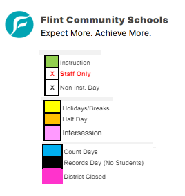 This Flint City School District instructional academic school calendar is extremely important as it keeps you informed of Schools Of Choice grading periods, early dismissal dates, staff development days and holidays for the Schools Of Choice calendar school year 2023-2024. As a parent and or student, you will find yourself needing this information on a regular basis, so please "like" and bookmark this page in a visible location within your favorite browser. The legend for this Flint City School District 2023-2024 calendar is at the bottom of the page. If you are browsing on your PC there is another copy of the legend in the right hand column.